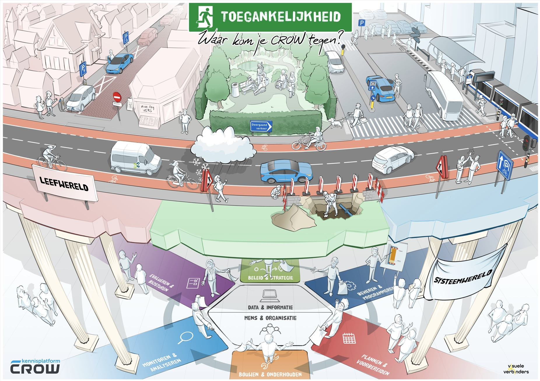 CROW heeft een praatplaat laten maken om intern en extern aan te geven waar zij mee bezig is als het gaat om kennis rond de toegankelijkheid van verkeer en vervoer en de openbare ruimte.