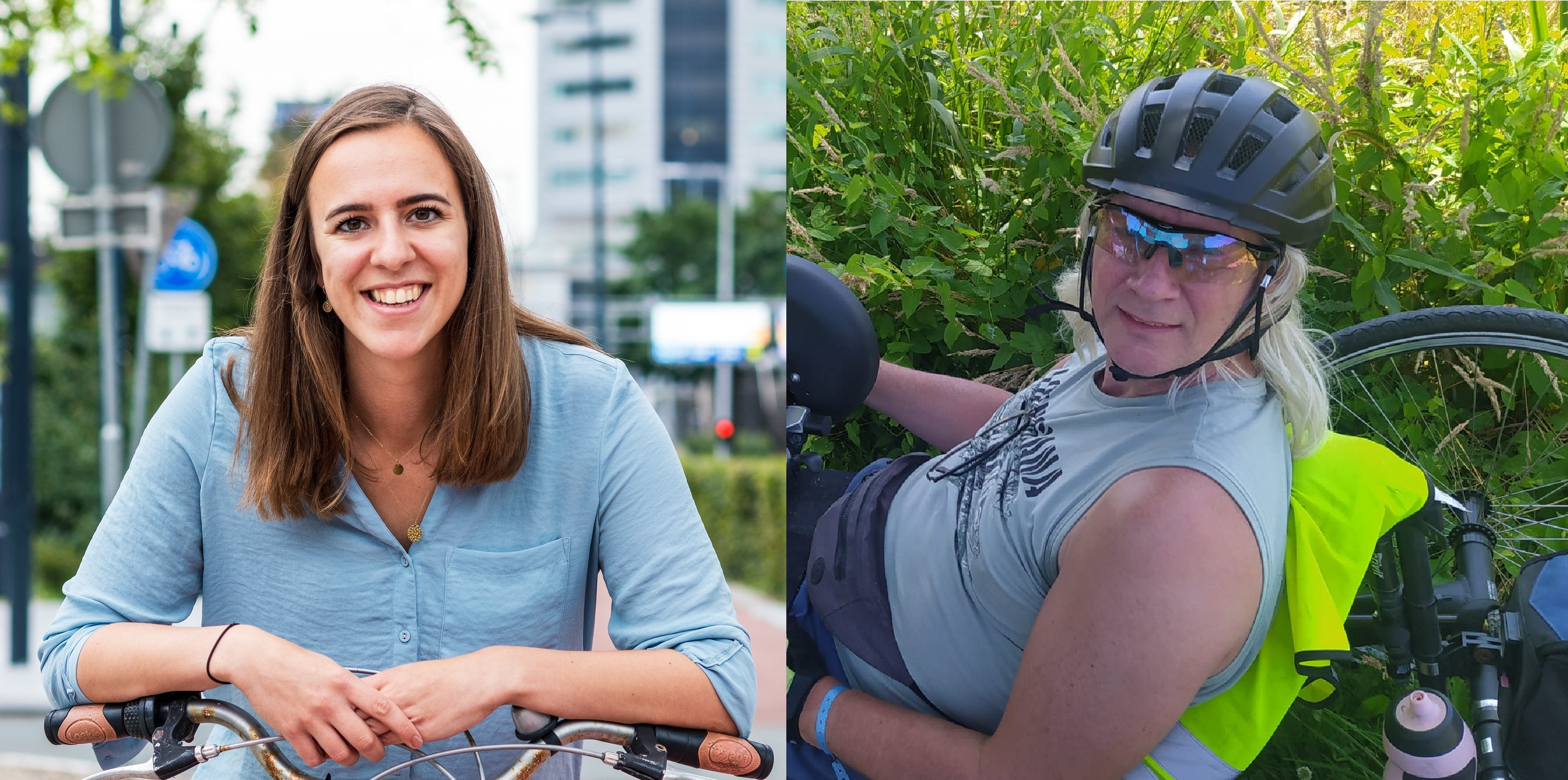 Karlijn Janssen werkt nu drie jaar bij de Fietsersbond. Ze houdt zich bezig met mensen voor wie fietsen minder vanzelfsprekend is. Zoals driewielfietsers en handbikers. Zij vormen een groeiende groep die lange tijd onvoldoende in beeld was, vertelt Karlijn. Tino Zijdel is één van hen. Hij kreeg twaalf jaar geleden een functionele beperking aan zijn benen. Via een tante kwam hij in aanraking met een handbike, die hij ook gebruikt in combinatie met een rolstoel. Sindsdien fietst hij veel in zijn woonplaats Hilversum en omgeving. Daar raakte hij betrokken bij de lokale afdeling van de Fietsersbond en de community Iedereen Mobiel.